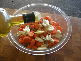 I peeled, trimmed, and sliced my carrots and mixed carrots, thyme, and garlic, with a few tablespoons of extra virgin olive oil. Toss to coat.